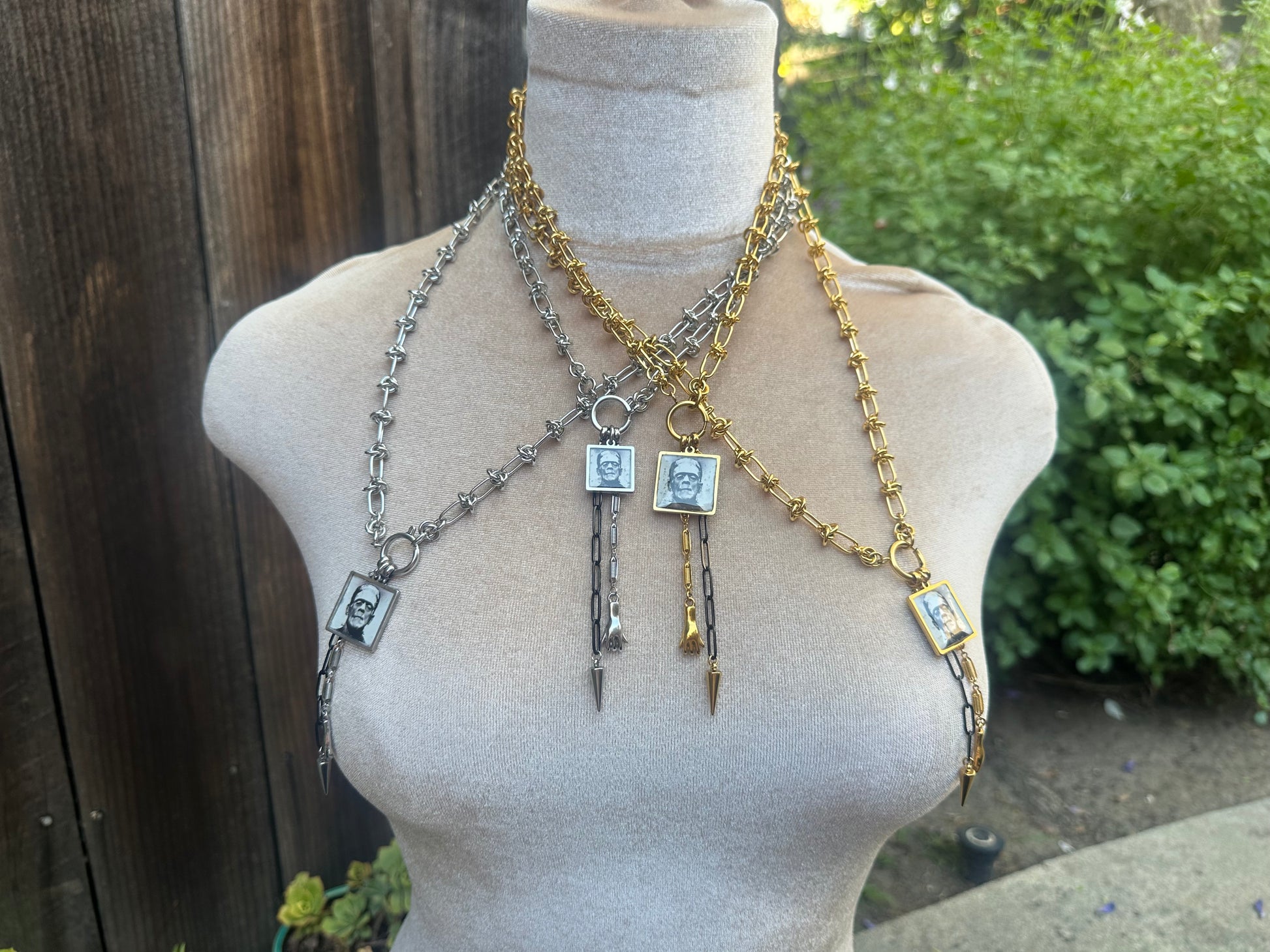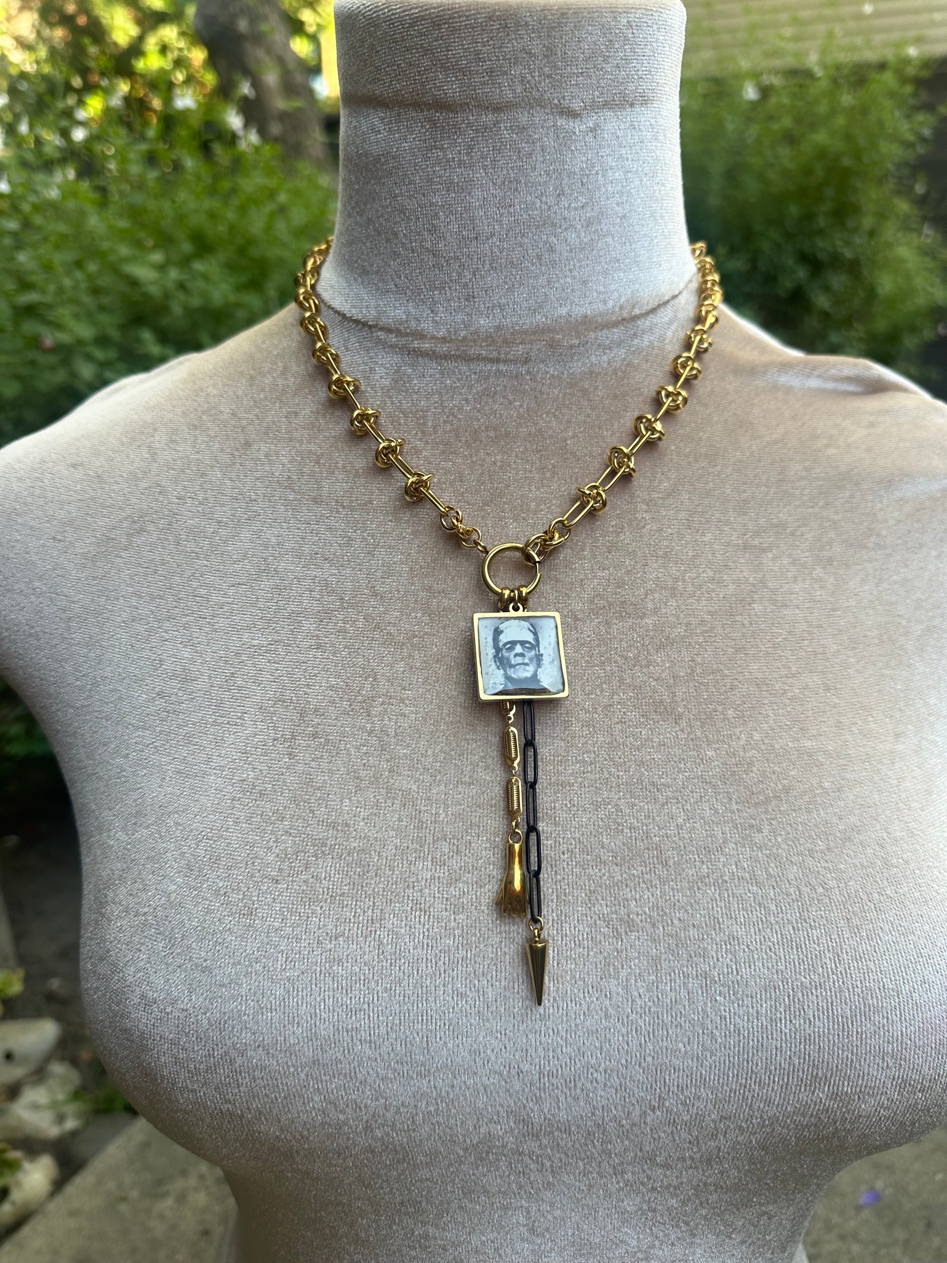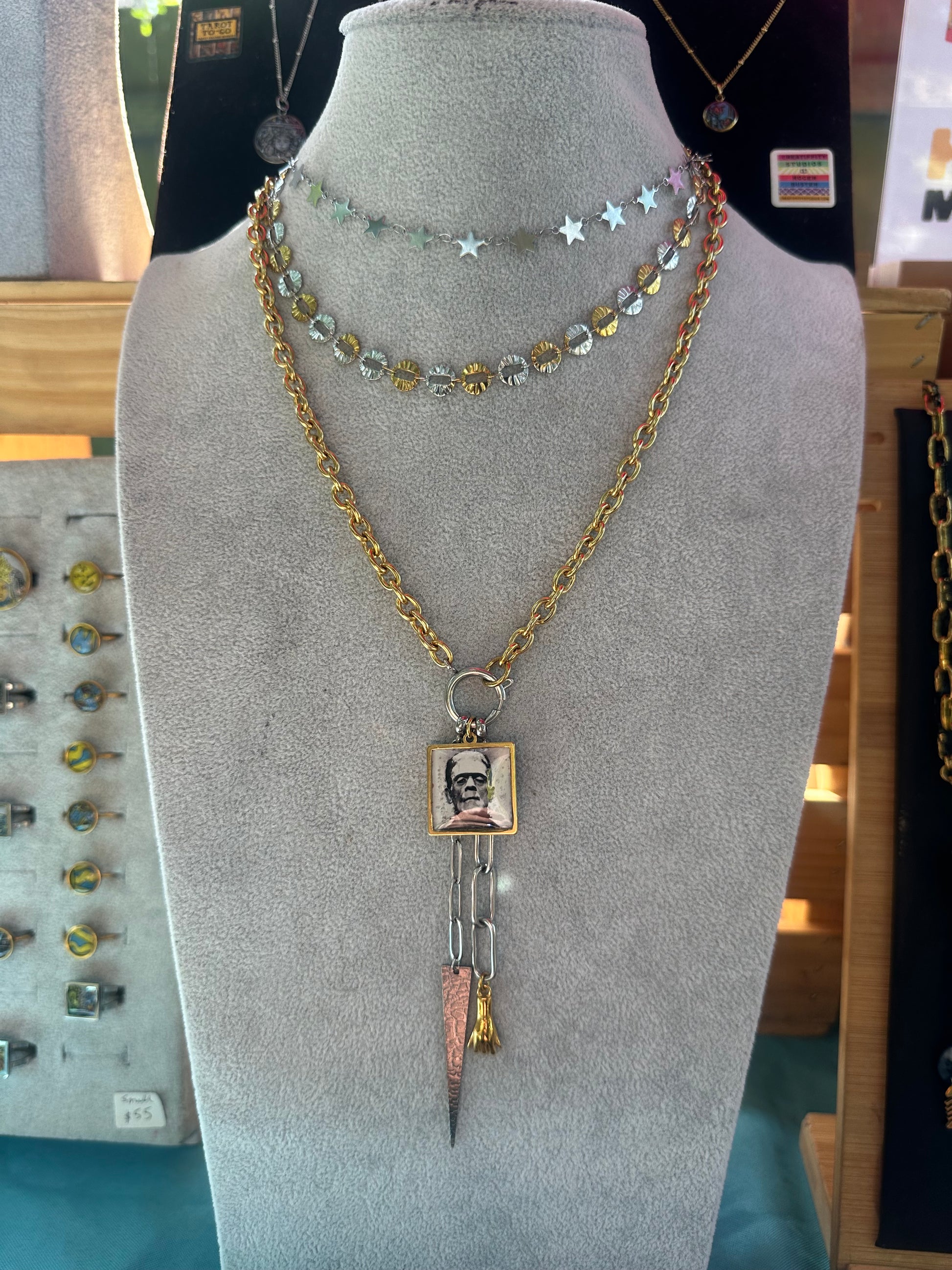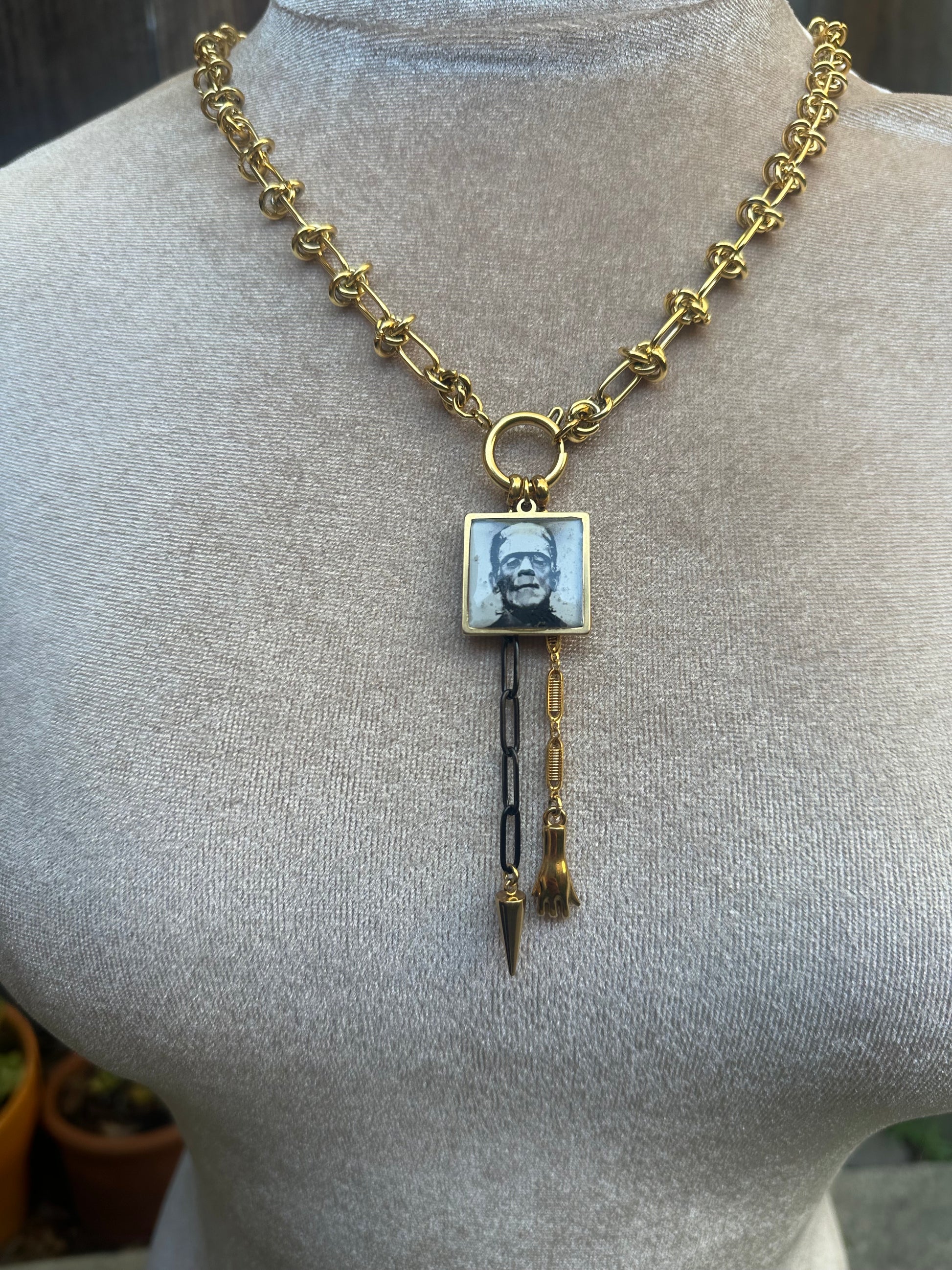 What do jewelry-making and assembling a sentient, eldritch horror out of pieces from discarded corpses have in common? The parts you choose matter. Rest assured, like Dr. Frankenstein, CreaTiffity Studios puts the utmost care into building things right. The heart of your piece is a fully waterproof bezel celebrating Boris Karloff's iconic portrayal of Frankenstein's monster in several classic films from the 1930s. A spike and a disembodied metal hand are also included to get you started on your monster assembling journey. Unlike reanimated flesh and bone, your stainless steel jewelry piece should stand up to any weather!